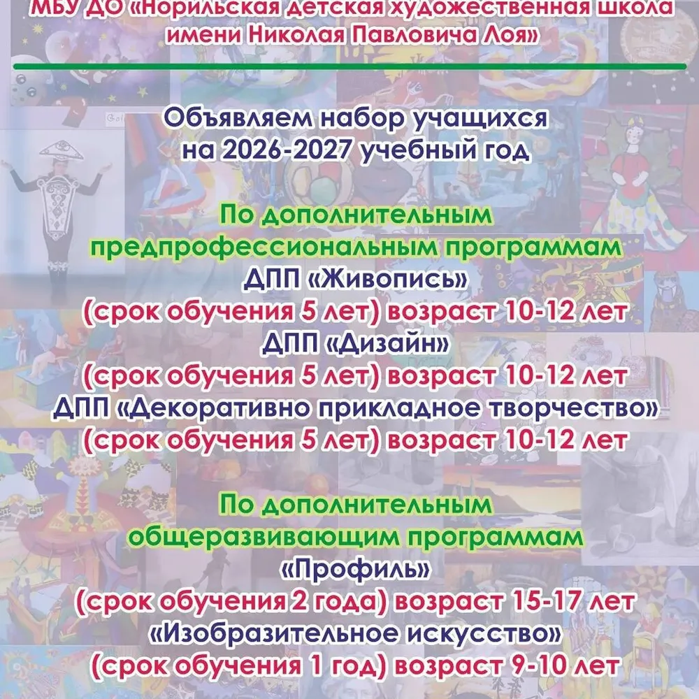 Норильская детская художественная школа имени Николая Павловича Лоя – это место, где каждый ребенок может раскрыть свой творческий потенциал, научиться видеть красоту в окружающем мире и создавать свои собственные произведения искусства. Мы стремимся воспитать новое поколение талантливых художников, которые будут не только развивать свои способности, но и вносить вклад в культурное наследие нашей страны.
